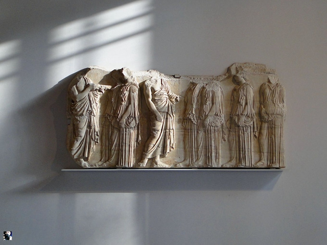 在这块巴特农神庙东侧檐壁的装饰残片上我们可以看到被称为Ergastines(厄嘎斯婷娜):每年被选出来侍奉雅典娜的年轻女孩。少女们的雕像,她们的职责是在一年一度的Panathenaia(巴拿特纳亚)庆典时,纺织敬献给雅典娜女神的佩泼洛斯女装Peplos(羊毛裙)。这件作品中,理想化的神灵世界的美感被若干写实的细节弱化:如刻划得栩栩如生的男子手臂上的肌肉和青筋,以及少女们所穿佩泼洛斯的裙裾的细致织纹。此外,雕塑原本颜色(蓝色和金色)已褪去,使其不复昔日的华丽,而显得朴素。某些历史学家认为从巴特农神庙的雕塑作品中可以看出古典艺术已经在抽象主义与写实主义这两种对立的艺术派系之间取得近似完美的平衡