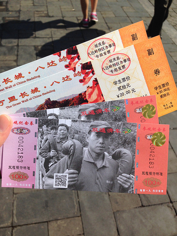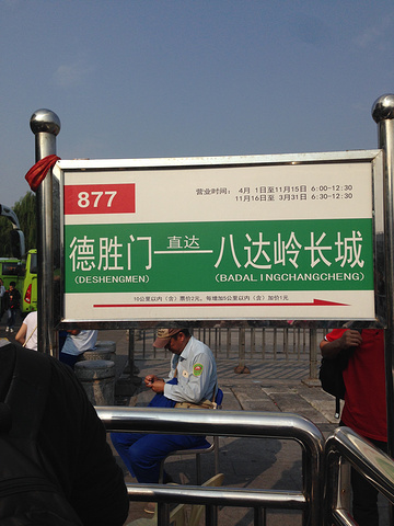 在网上查了攻略说要坐正规的公交车,要找到这个标志牌,我们依旧是兜兜转转,找了好久,最后才终于成功找到这个牌,千万别坐黑车噢,会坑你的。坐这个车,每辆车上还会有导游,跟你讲长城的一些历史啊之类,会告诉你等下到了那里买套票比较划算,后面大家就可以看到我们买的就是套票