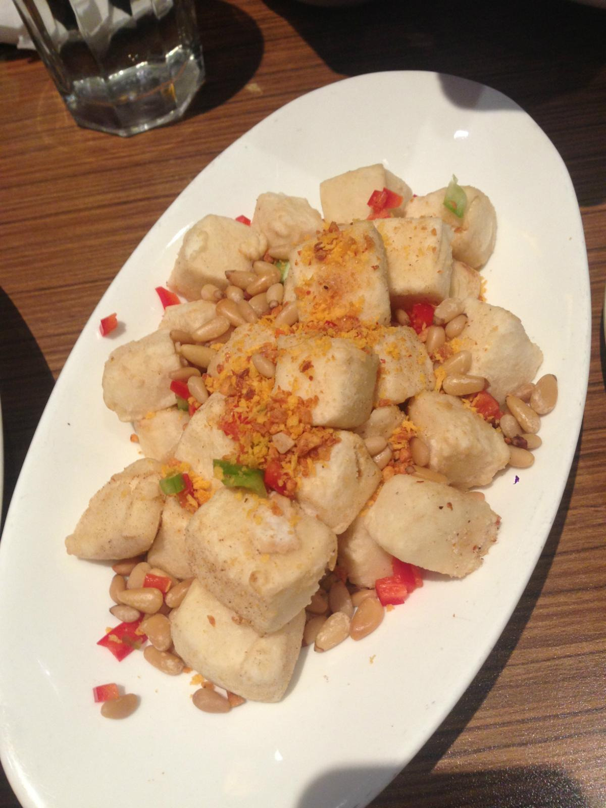 餐厅内的服务人员不是很多,不过服务态度和效率尚可。我们刚坐下他们便递来了菜单,仔细看了一下感觉这家餐厅里面主要是以粤菜为主。我们一共点了腊味拼盘、清炒空心菜、牛肉粒炒菌菇和磨豆腐四个菜,上菜的速度还算是很快,仔细品尝了下感觉腊味拼盘里鸡鸭的味道不错,而其余的肥肉含量太多,虽然口感不错但是毕竟不算是健康饮食,而且吃多了还是会觉得有一丝的油腻;清炒空心菜的味道很棒,味道很到位,感觉很有本色的滋味;至于牛肉粒炒菌菇,个人感觉牛肉烧纸的很香嫩,可惜分量太少了,而菌菇感觉略微有点烧焦了,吃起来有些生硬;而磨豆腐很不错,外酥里嫩的味道让人赞不绝口。
