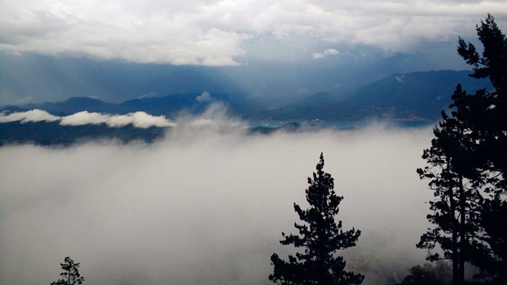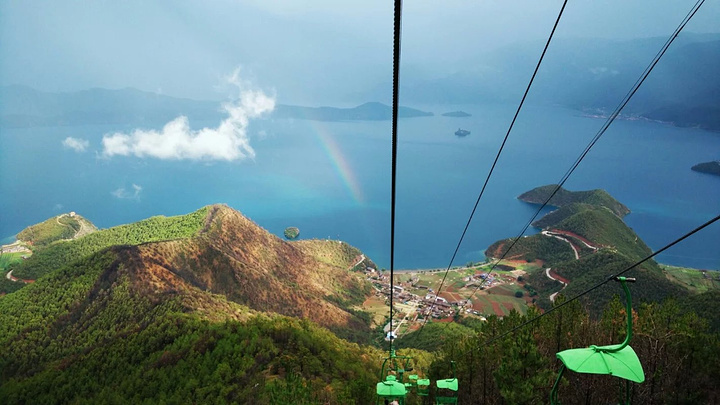 下山的时候,云雾散尽,天也开始放晴,我们竟然有幸邂逅了一弯彩虹,挂在湛蓝的湖面。坐在半空中俯瞰雨后彩虹,又是一种难得的回忆。