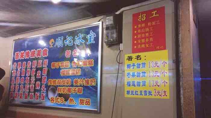 顺记冰室是广州很出名的店了,很多攻略也有提到过它。 【交通】地理位置优越,交通方便,坐地铁1号线到长寿路站恒宝广场出口直走几分钟就能发现位于宝华路的顺记冰室,附近有宝华面店,陈添记等知名老字号。喜欢吃的朋友可以一间间吃遍哈哈。如果坐公车的话也有很多线路可以到达,坐到恒宝广场总站,上九东等都可以到。下车走一小会儿就能看到了,而且店面位置比较明显 【环境】门口招牌顺记冰室这几个字十分明显。门口的橱柜上摆放着一些出品的模型,上面标注着名称和价钱,让人一目了然。看着也挺好吃的,一进门口墙上有贴着顺记的招牌产品。里面店面不算大,不过也算宽敞。桌子挺多的,有时候可能需要和别人搭台。灯光比较昏黄。 【服务态度】我觉得还挺好的,不像有些老字号的服务态度差到要命。 【出品】去前台那里点餐之后很快就端上来了,之前来吃的都是双皮奶姜撞奶等,这次点了杂果伴雪糕,不得不吐槽一下杂果,竟然用的是罐头水果,讲真广州水果也不算贵,用新鲜水果比罐头水果好吃多了,这样挺影响口碑啊,看来下次点雪糕还是不要加什么东西好了。之前吃过榴莲雪糕,榴莲味倒是挺重的,双皮奶和姜撞奶好评…… 看到菜单上除了甜品也还有粥粉面等,反而觉得跟冰室有点违和。 【总体】值得一去 双皮奶姜撞奶榴莲雪糕不错。