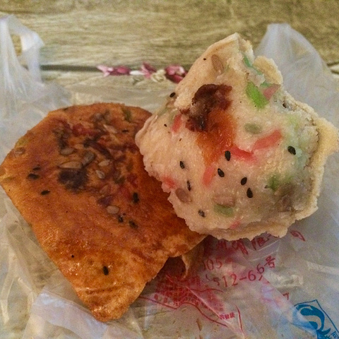 一间老店外卖窗口买的海棠糕和梅花糕,五块一坨。糯米硬壳+满满的豆沙馅,没有现在的点心细腻,但比我想象的好一点
