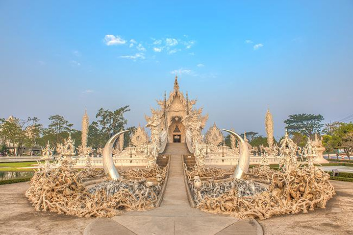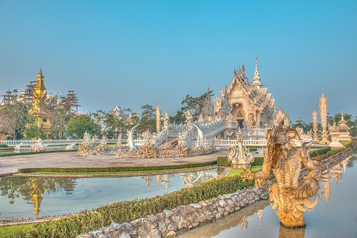 我们就骑上摩托直奔白庙。我们出发的时候,天还没亮。夜里一辆摩托在无人的公路上狂飙,这样的经历我都有过很多次了,每次感觉都觉得非常爽,但心里多少还是有一点点安全上的担忧。 这里说点和景点无关的内容。我们清晨在清莱骑摩托车,路上有不少红绿灯,我发现我们遇到的泰国人,他们都非常守交通规则,没有任何人去闯红灯。汽车自然不用说,关键是摩托车也没有任何人闯灯!要知道,清晨天还没亮时,很多路口完全是没有行人和车的。而有些路口甚至是丁字路口,摩托车旁边就根本就没有行人通过的道路,我更没有看到什么所谓的电子眼,即使如此,也没有任何人闯灯。这当时真的有点震撼到我了!由衷的佩服泰国人民!后来回想起来,在大城和清迈,我们骑摩托时,也没有发现任何人闯红灯(包括之后去的越南)。 额,说回游记。到了白庙后,天还没亮,当时已经有几个北京搞摄影的也到了这里,准备拍日出。但是白庙开门好像是7点半以后,这群北京人就想翻进去拍,结果人家门口的“管理员”就出来阻止他们,一聊之下,才知道,原来这个“管理员”就是白庙和黑庙的设计者(我靠,我这是见到大师了么?)。然后北京那群人就拿了个什么摄影协会的证给“管理员”看,意思是让他们拍,他们可以帮他宣传一下这个地方。结果人家非常反感,说他修这个庙根本不是为了赚钱(当时英文也没完全听懂,大概意思是说为了艺术和信仰之类的吧),更是根本不想要宣传,要赚钱,白庙现在游客这么多,他随便收个门票啥的还赚不了钱不成?要想进去拍,必须等到开门时间,当时那群北京人一下就哑蛋了,。这里我又想吐槽了,并不是啥地方都和咱们天朝一样,就只知道钱钱钱。 其实白庙并不适合拍日出,因为太阳升起的地方是白庙正面的反方向。但是日出时分,白庙会变成金庙,看着还是非常震撼的。所以,建议有兴趣的朋友,可以日出之前就赶到这里。而且,白庙到了开门的时间,绝对就人山人海了。所以,要想拍张没游客的照片,你也得早点来。虽然进不去,但是可以在门外拍几张,有些角度也是非常不错的。