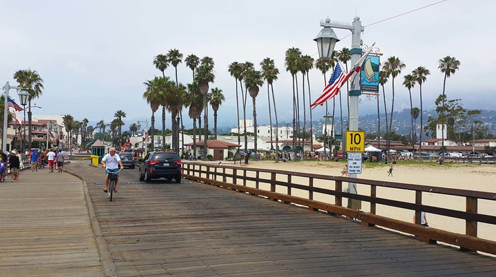 从丹麦村驾驶约四十分钟,不到中午十二点,我们抵达圣巴巴拉镇。 这座美丽的小城充满了迷人的地中海风情,道路两边都是标志性的棕榈树。据介绍该地区的平均房价高达96万美元(快要赶上北京啦),在美国富翁的10大理想居住地排名中位居第四名。圣巴巴拉还跻身《福布斯》评选出的10大餐厅城市之列。圣巴巴拉镇的主要景点是海滩上的栈桥一带,这里的海滩虽然比不上世界上其他著名的海滩,但也别有一番风情。海滩的路边免费停车2小时(但是车位也非常难找)。