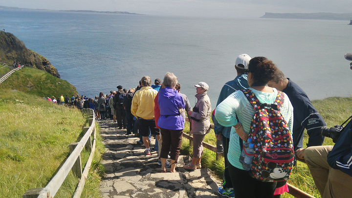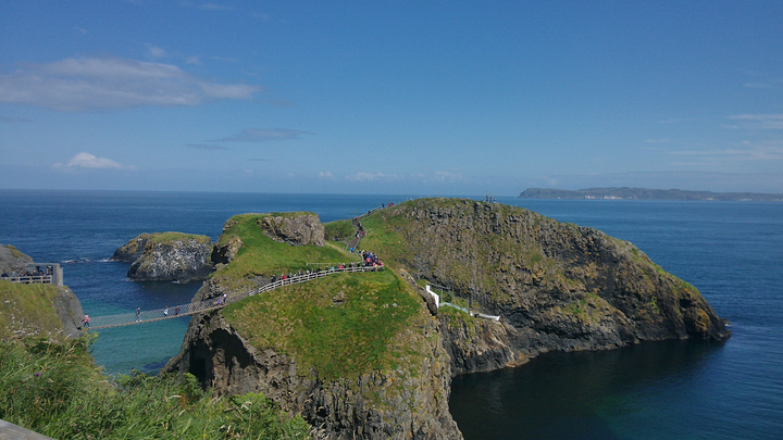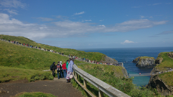 卡里克空中索桥(Carrick-a-Rede rope bridge) 接近巨人之路的时候先去了这个吊桥。这个时候终于来到了爱尔兰的海边,美地不像话啊,而且天气又这么好。我们的车停在峭壁边,峭壁下的左边是白沙滩,右边是散落在海里的岩石,碧蓝碧蓝的海水,应该是整个天空的蓝色都灌进了水里。海峡的另一头13英里以外就是苏格兰北部高地。从停车场走到索桥大概1公里,如果只是去索桥看看不过去的话是不需要买票的,如果想要走索桥,可以从司机那里直接买票,5.9英镑。 有这个索桥是因为有这么一个小岛,或者说一块巨大的岩石,它与大陆非常近,相距20米左右,但是却不相连。所以这个索桥其实是渔夫们建造的,大约400年前在这个地区就开始了大西洋鲑鱼的捕捞,而到300年前左右开始建桥,之前只能靠小船到达外面的小岛去捕鱼。直到1960年代,这里的捕鱼业都非常地兴旺,基本上每天可以捕上300多条鲑鱼。但是由于过度捕捞的原因,鱼的数量大幅减小,于是从2002年开始,捕鱼停止了,现在这里成为了来北爱尔兰的游客必经之地。 索桥长20米,离海平面30米左右,风大的时候会很晃,没风的时候就会有发疯的游客在上面晃荡蹦跳。既然是单行道,于是就是大排长队,一次会放四到五个人过去,过去到另一块岩石岛上,可以看到非常清澈的海浪和盘旋不断的海鸥们。我看现在游客们两个手抓着绳索还晃晃悠悠的,想当年渔夫们可是单手提鱼桶,单手扶悬索过桥。真是三百六十行,行行有绝技啊!