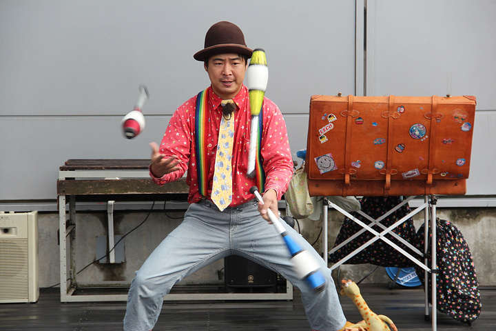 商场外面有杂耍艺人,尽管语言听不懂,但女儿仍被滑稽的表演逗的哈哈大笑。
