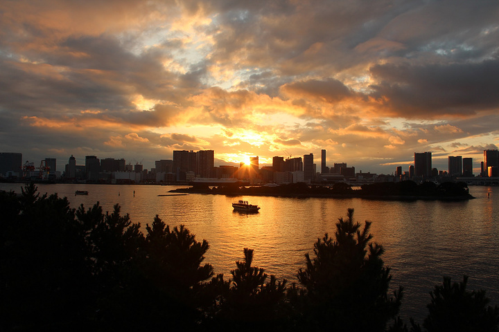 和上海比,东京的天黑的有些早,下了一天的雨,傍晚的时候居然天晴露出了夕阳,红红的,照的东京湾一片朦胧。