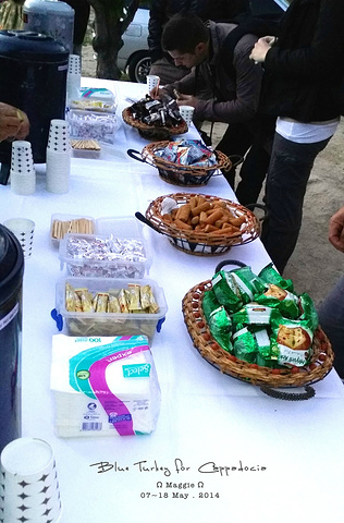 现场在野外架起了一个长桌子,上面有些饼干和泡的热饮,我们喝了点热茶取暖。 真心冷。。。。我是长袖衬衫+针织衫+皮夹克+冲锋衣外套。。。。女生不要穿高跟鞋 工作人员会给一个本子,让每人签名并且写上酒店名字,然后根据酒店,给我们分好热气球。