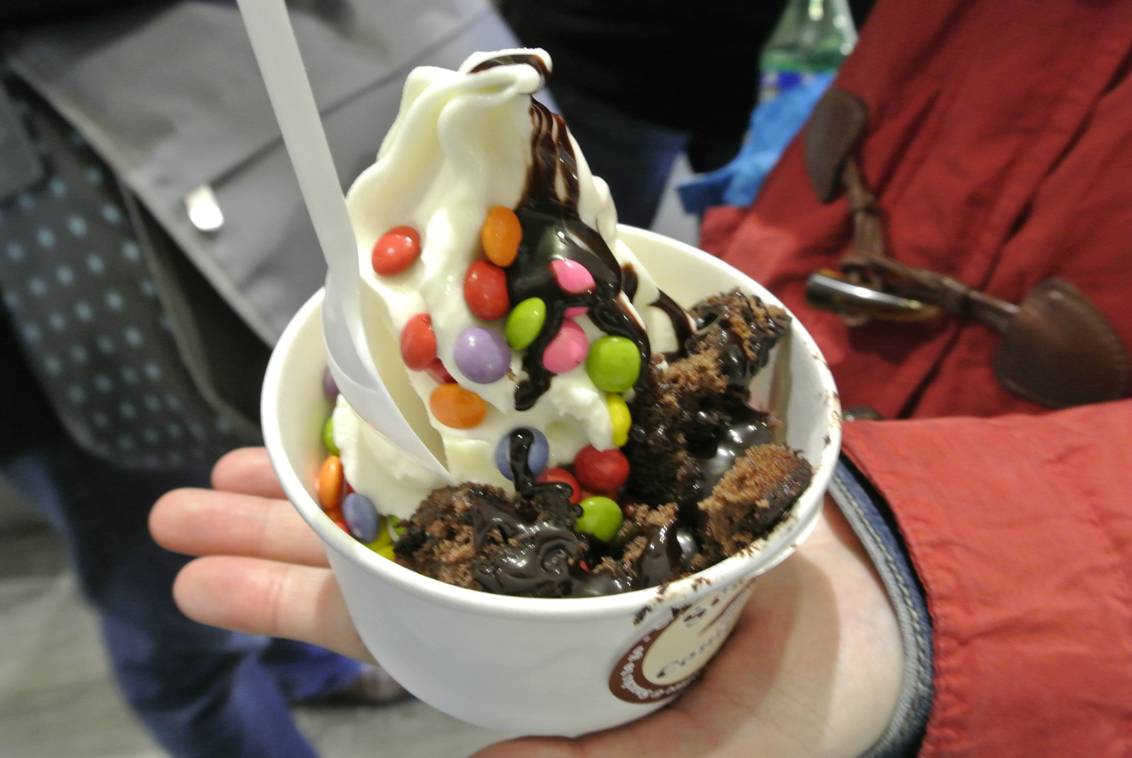 市场里卖的冻酸奶,也就是四五欧一杯,加了巧克力,非常漂亮