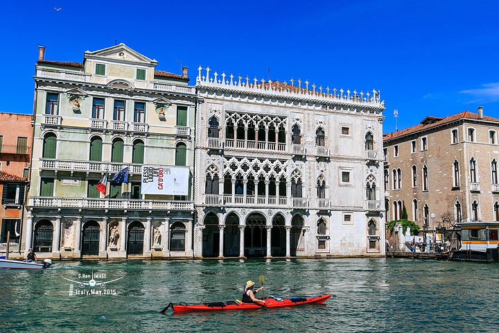 看到贡多拉没有小学在书本上的感觉,这些小船如今已经变成了高大上的旅游工具,每一个贡多拉都弄得非常漂亮,但是我还是喜欢古朴一些的。所以,坐一坐贡多拉的打算就被这高大上的装潢给打消了。 继续我们在威尼斯的暴走吧,走着走着就看到了建于1440年的“金屋”,威尼斯最杰出的哥特式建筑,廊柱上像四叶草一样的花纹,现在是Franchetti美术馆。这种地基在水中的建筑,还真是有种被水淹了的感觉。