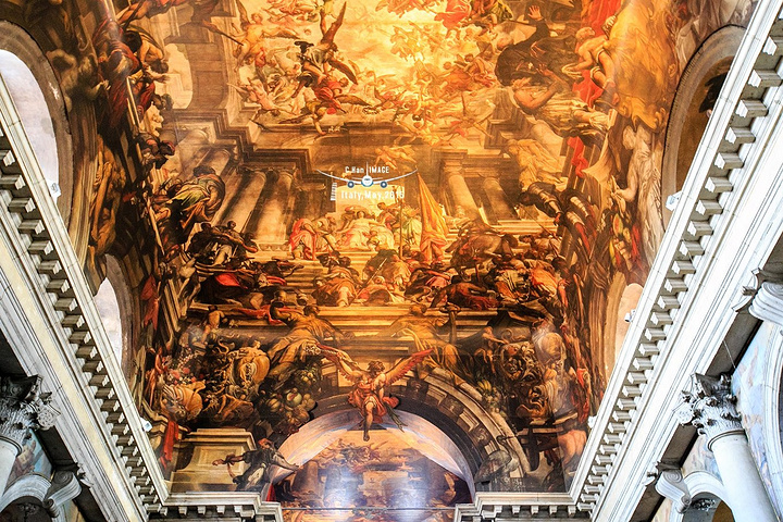 早上天空中下起了小雨,在去威尼斯美术学院的路上,先来到了圣潘塔隆教堂,据说这里的教堂天顶的绘画非常震撼!进入教堂的时候,没有一个人,工作人员看到我们进来之后,有礼貌的问早后,就把天顶的灯开开了,并告诉我们不能拍照。但是看到这绝世惊艳的用生命绘画的天顶,管不住手的又按了一下快门。 尽管这不是文艺复兴时期的作品,但绝对值得大赞,画作的透视感和立体感十足,这种立体感犹如我们在西斯庭看到的一样,仿佛人都是3D的,呼之欲出。画家吉安.安东尼奥.福米阿尼将圣潘塔隆医生的生平和殉道时壮观的情景画在天顶,他花了24年创作,最后从脚手架上摔下来而死去,也葬在了这座教堂内,让他可以永世注视着倾注了他全部生命的天顶。