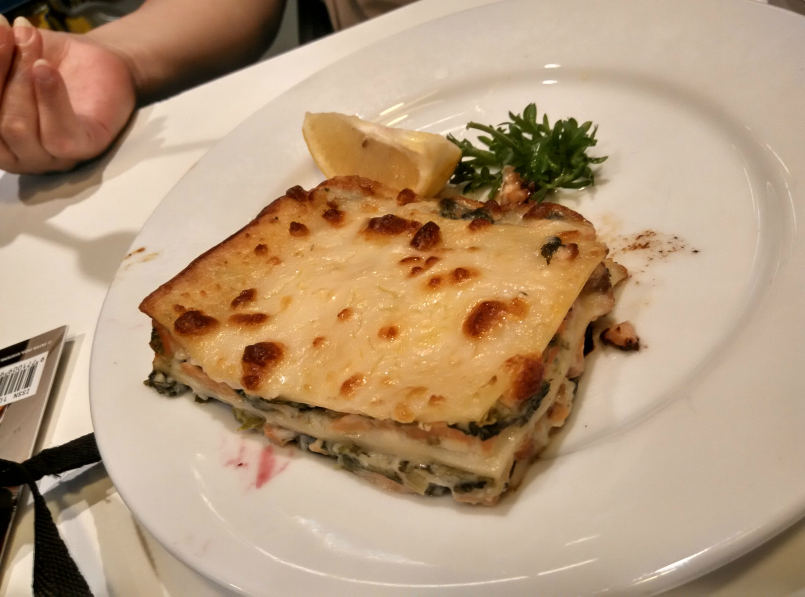 刚出锅的意大利千层面,金枪鱼的,因为刚出锅,自己做过千层面,红酱白酱做的特别复杂,于是决定吃别人做的,不过说实话这个不太正宗,里面的蔬菜烤的太久感觉像烂菜叶子口感。