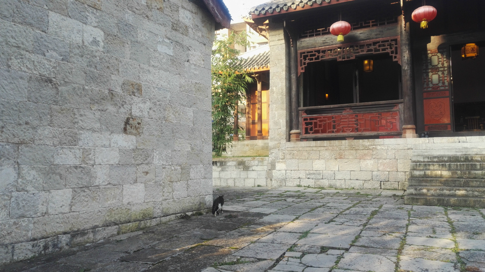 尽管对喝茶没有什么太多的爱好,但鉴于此处幽静的环境,便要了一杯毛尖,安静地坐在树下,细细的品味传统文化的魅力,间或的鸟叫也会将我拉回现实的生活中,时间就如同墙角的那只小猫,偷偷地我身边溜走了。