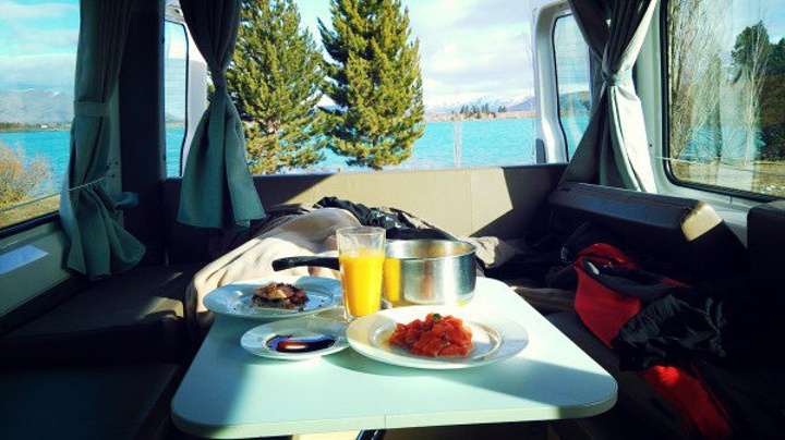距离三文鱼场不远的地方(出门往库克山方向走几百米)就有一个房车免费营地,类似于公园,临湖风景很美,所以选择在此做午餐。