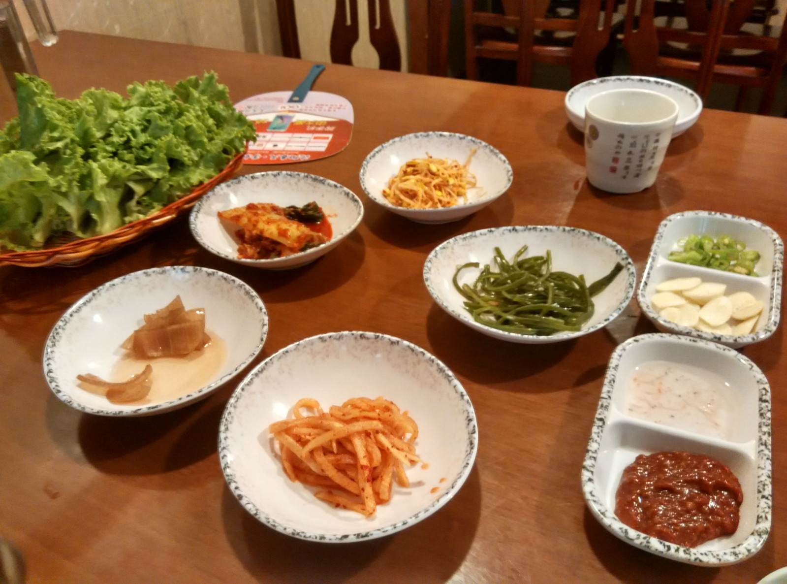 配菜加小菜上来一大桌子,真是震撼了我。解释一下右下角的盘子里有两种蘸料,下面那种酱料很神奇,肉肉配上它之后有种化腐朽为神奇的感觉,忽然味道就变的高级了,有骨子熏烤的味道,很特别,旁边汤汁是虾酱,清淡的那种。肥肉的部分就可以加蒜片辣椒片跟泡菜卷在生菜里吃,解腻