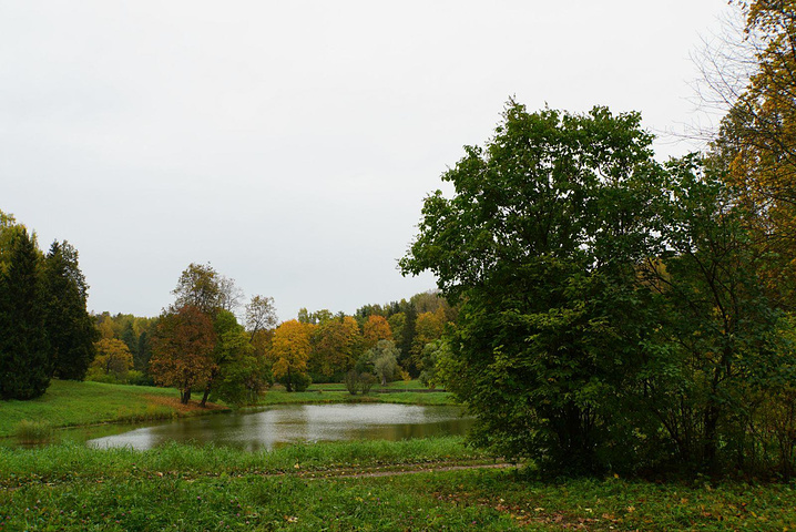圣彼得堡的第二天,上午阴,下午中雨(哭了)。先地铁再小公交车,本来想直接去叶卡列琳娜宫殿的,谁知道乱坐车(可是明明写了,也问了司机是去普希金城的,哭笑不得),先到了巴甫洛夫斯克公园。算了,既然来了就逛逛吧~这是一个很大的郊野公园,秋天很美,空气很清新,树林中漫步的感觉很赞,好希望中国也有更多的这种公园。