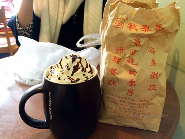 每天都想吃板栗,毕竟现在可是吃板栗最好的时候~真是生财之道。隔壁的咖啡店更逗,写着在本店消费不用排队