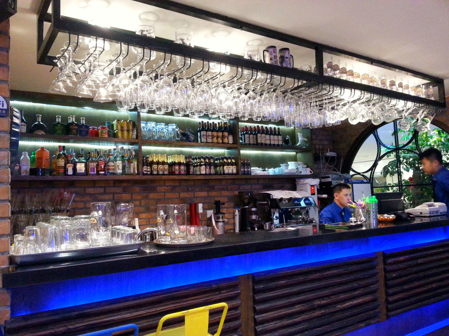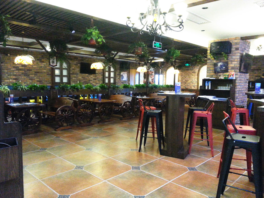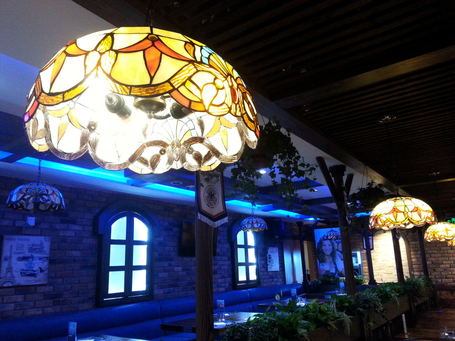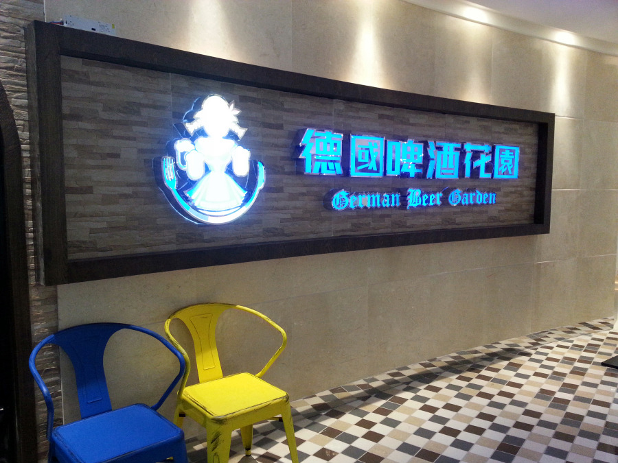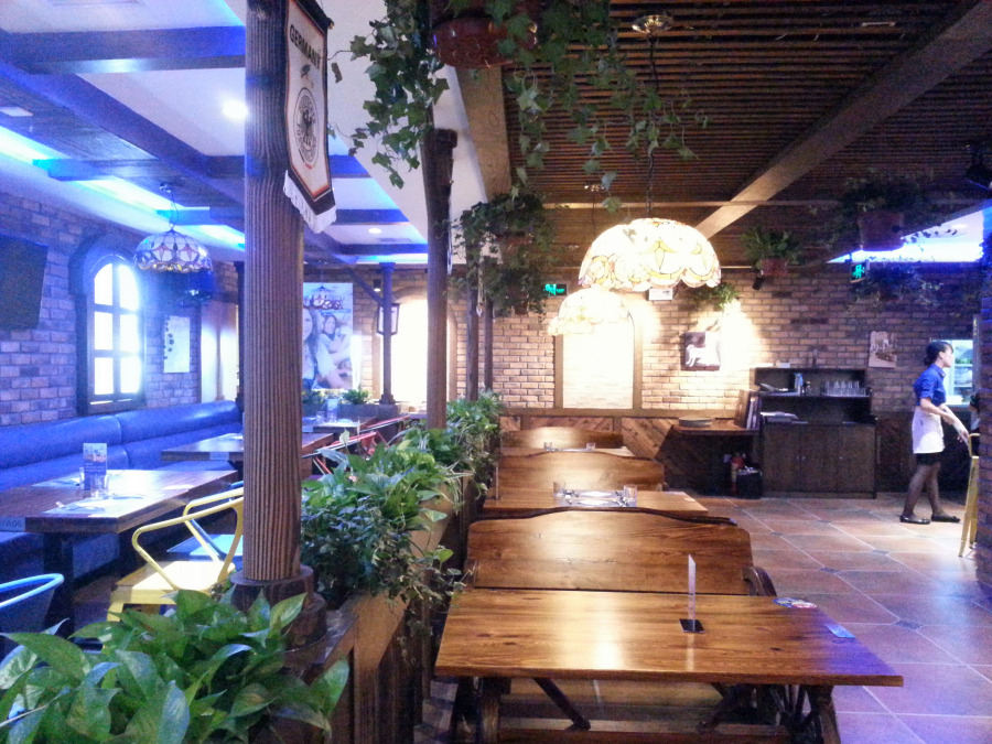 装修很有格调的一家德国主题餐厅!餐厅位于淮河路步行街内的百大·鼓楼名品中心,乘坐公交到市府广场公交站,下车后步行大约4-5分钟到达百大·鼓楼名品中心后,乘坐电梯上8楼即可看到餐厅。这家德国主题的餐厅是以德国著名的啤酒为主题的,而餐厅的标志性图标就是一个德国女郎拿着3杯啤酒,然后旁边有刀子和叉子。餐厅的门外就放了一个很大的啤酒桶,餐厅外面还有提供给排队等候的客人座位。一进入餐厅的右手边就会看到一个酒吧台,酒吧台的顶上挂着无数的高脚杯和啤酒杯,酒吧台的后面也放了很多名酒。餐厅的内部装修也非常有特色,以幽蓝色的灯光为主,整个餐厅都很有酒吧的气氛。而餐厅里面提供了三种座位,一种是适合把酒谈心的高个的座位,另外两种则是适合吃饭的桌位,其中一种是像一个木头车字一样的,很有艺术感。餐厅里面的还有很多绿色盆栽和漂亮的灯饰,就连给客人餐前洗手的洗手台也是非常精致的。餐厅服务员热情细心,一进入餐厅就有人领位置和倒水,然后再递上菜单。这里主要提供德国啤酒、扒类、饭类、甜品等等,人均消费大约50-60元左右,当时我们点了两份咖喱牛腩芝士焗饭和两杯金桔柠檬冰爽,两杯饮料点了以后几分钟就上来了,因为饭是要焗的,所以等了大约10分钟才上来,这个可以理解的。而且这个饭的份量很足,味道也很好,芝士味道很足,牛腩也很大块,很入味。总体上这家餐厅无论是餐厅环境、服务水平还是食物品质,都是值得推荐的!