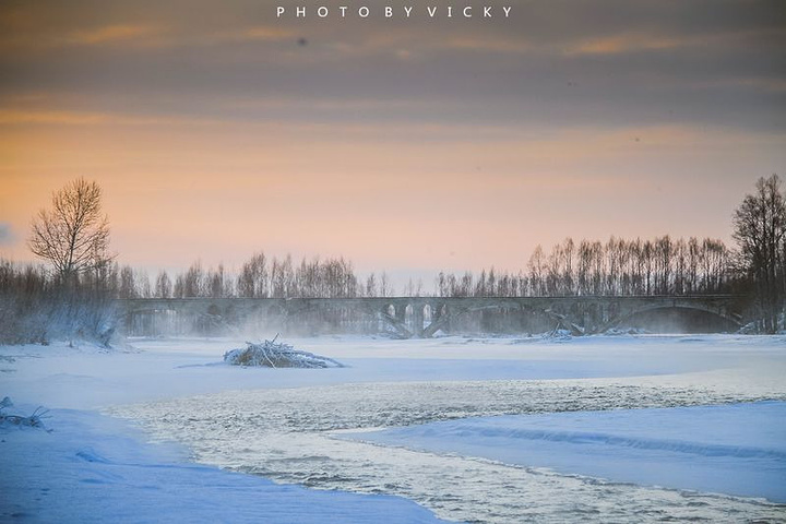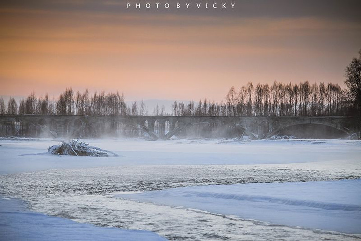越往里走,越发现美景!河边大部分被冻住了,但破冰船破冰之后,河流还继续流淌,形成的水蒸气漂浮在江面上,形成雾气,再加上朝霞的映衬,美cry了。