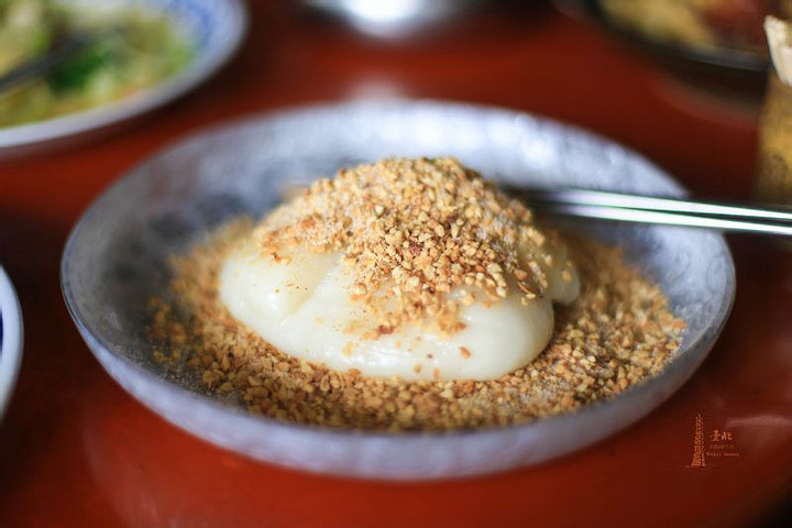 麻糬,大家可能都只吃过小个小个的麻糬,这是一整个面团,上面撒上花生碎,端上来的时候还是热的,很有口感。
