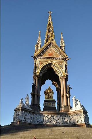 两个小时的走走停停,穿越皇家驿道,来到公园的南端。在夕阳映照下格外耀眼的是英国皇家阿尔伯特纪念碑(Albert Memoria)。纪念碑是1872年由吉尔伯特爵士设计,当年的维多利亚女王亲自为英年早逝的夫君纪念碑揭幕。