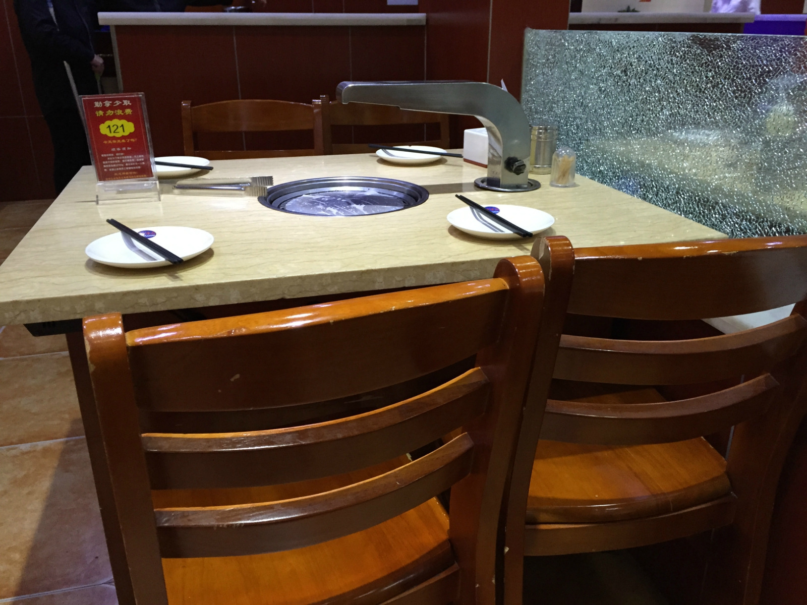 安排我们坐的是这种木凳子的4人座,不过也是一个烤锅,不错。