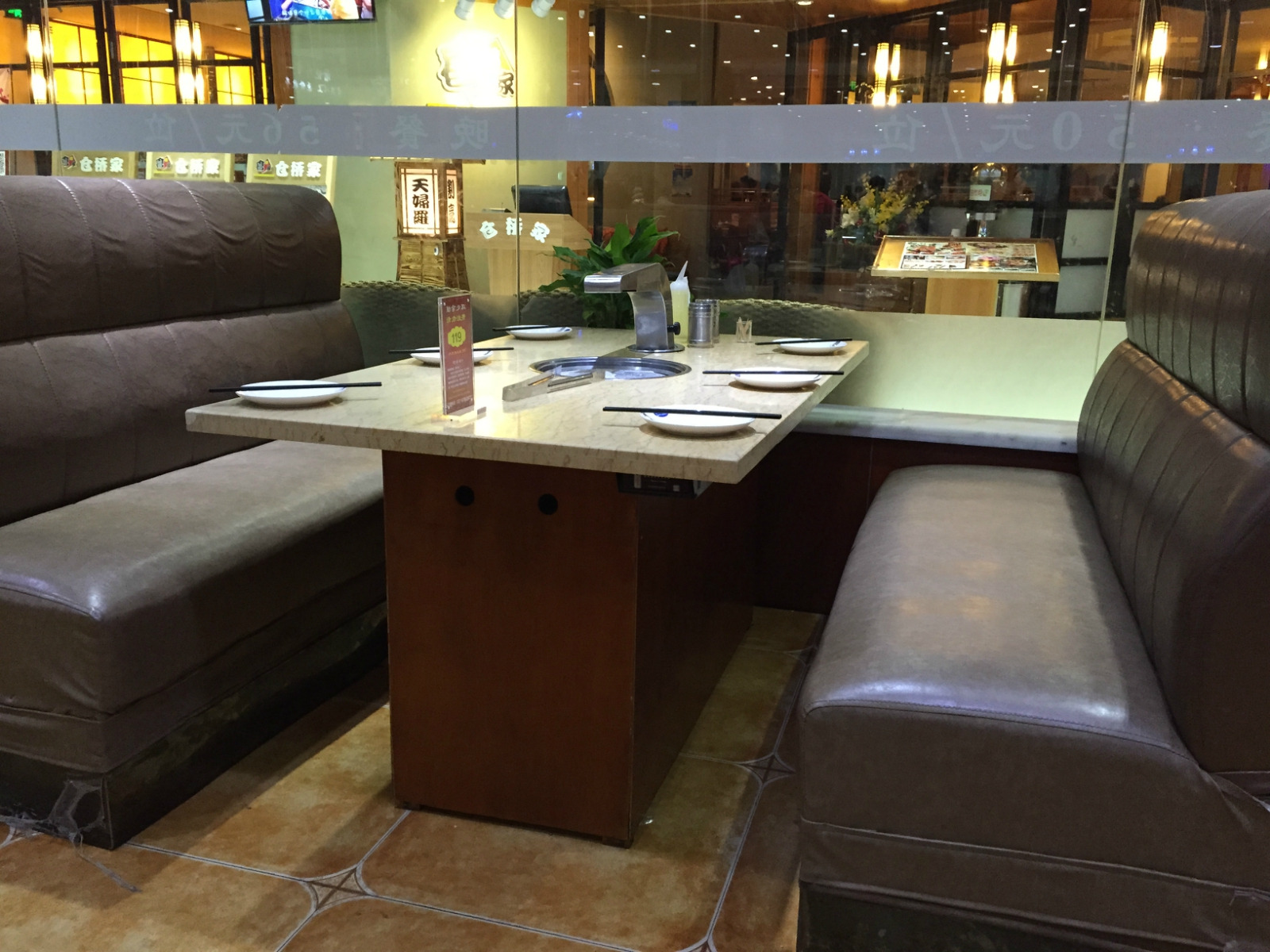 店里6人座是沙发椅,一个烤锅。