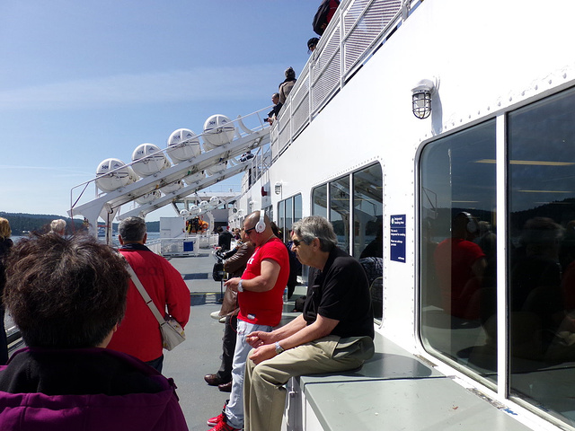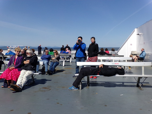 因为今天天气也很好,所以甲板上也有许多人站着坐着欣赏美景沐浴阳光