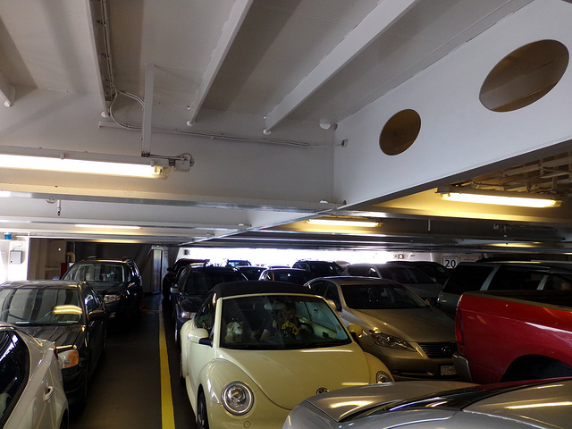 很准时,到了11:00,前方车辆放行 虽说停车场停了几百辆车辆,但是在井然有序的次序下,才一会儿的工夫,就全部开进了渡轮那好几层的车库里。 停车、关门。人们都离开车辆上到最上面的几层,那里的休息室里有餐饮和娱乐设施提供