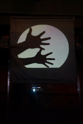 手影通过投影仪出来,狗、马、兔、鸟等等,惟妙惟肖。