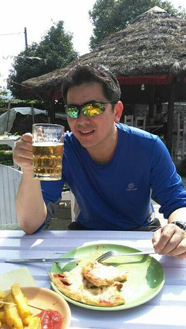 这个湖边的饭店景观的确一流,坐在露天的餐桌旁,沐浴和煦的阳光,品尝着美味佳肴,喝着当地的啤酒,还不放过湖边的人文美景