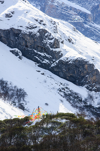 在半山腰处看到还有藏民的玛尼堆, 在白雪的映衬下格外庄严。