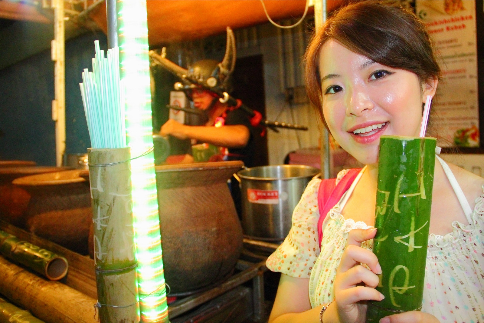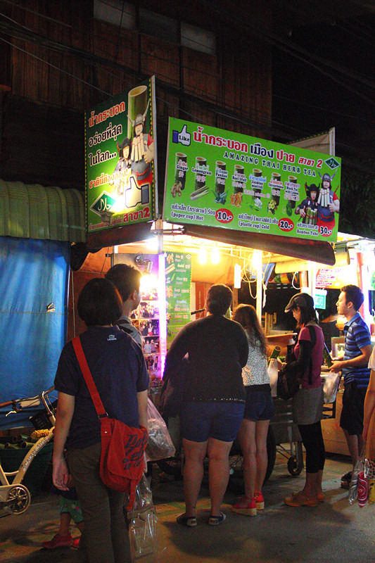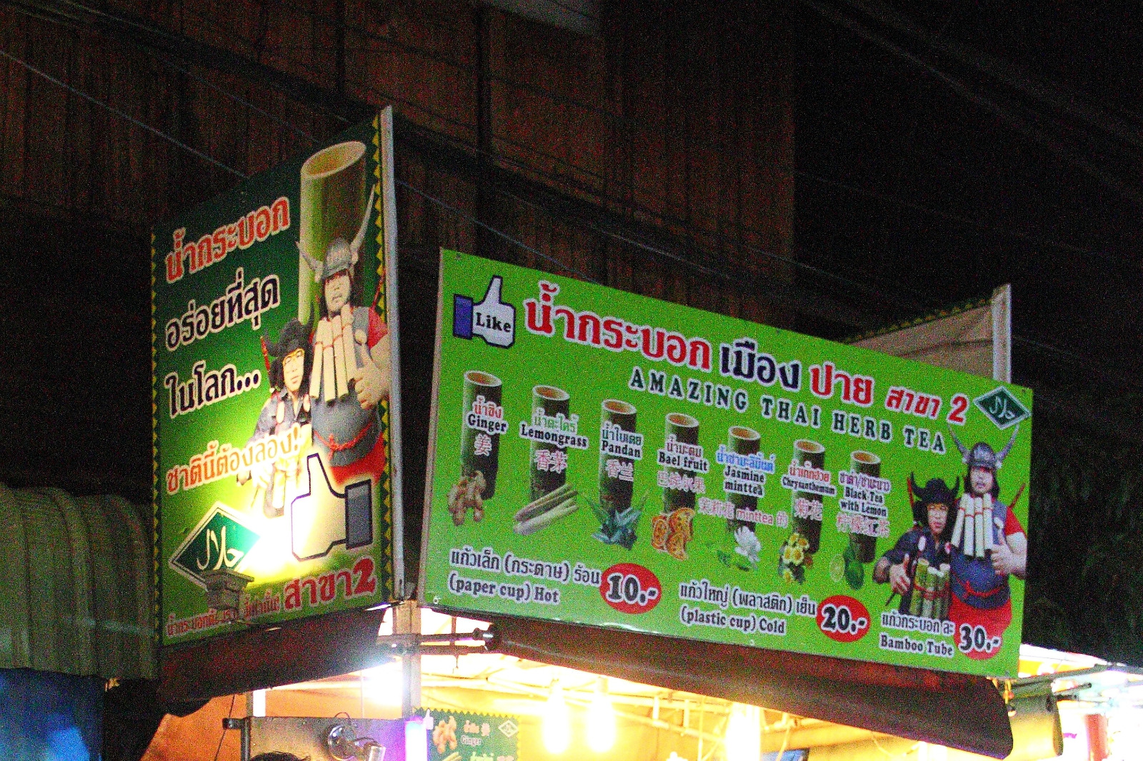 店里售卖的茶,总共7种,都写在招牌上面,分别是:姜、香茅、香兰、百香果、茉莉花薄荷、菊花柠檬红茶。茶不算特别,在夜市里也有其他店在卖,这里特别的是,店主的牛角打扮,和这里的凉茶装在竹筒里卖。竹筒上面刻满不同文字内容,竹筒放在摊位前面,随客人挑中喜欢的筒,挑好交给店主装凉茶。用竹筒装,是这家店最特色的,所以也是最贵的,要30B;用塑料杯装,便宜一点,20B;用纸杯装最便宜,只要10B;换算成人民币,分别是6元、4元、2元,很便宜划算。