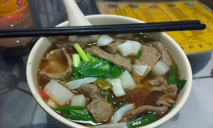 通常牛三星指的是:牛心,牛肝,牛腰。。。楼猪不会告诉你们在吃之前楼猪并不知道这件事。。。楼猪想到会是牛杂了,但是没想到这么杂。。。楼猪其实以为会是牛肚、百叶、牛舌之类的东西的。。。这里的牛三星汤放了很多胡椒粉和韭菜来遮腥味,所以汤喝着还是不错的,但里面的那些心肝肾之类的吃起来就真的有点腥了。。。童鞋们慎点哈。。。