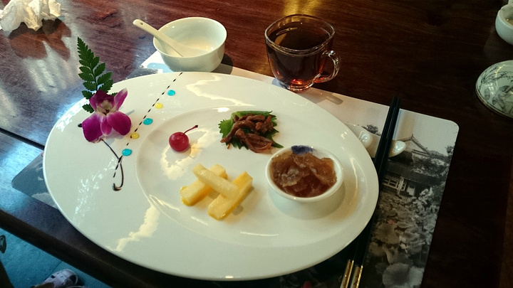 酒店不大,景观也很有限,可能靠近景区的关系,又加上本身就是老宅,不便做太多改动。二楼上去有一个很大包厢可以吃饭,外面则是一处看起来还算精致的小景观。适合拍照。哈哈·····