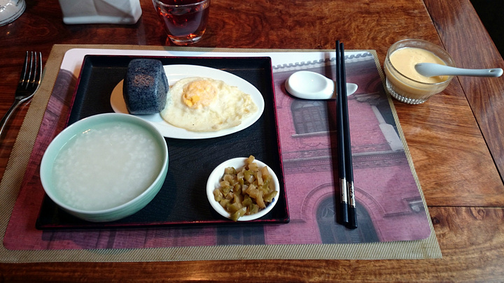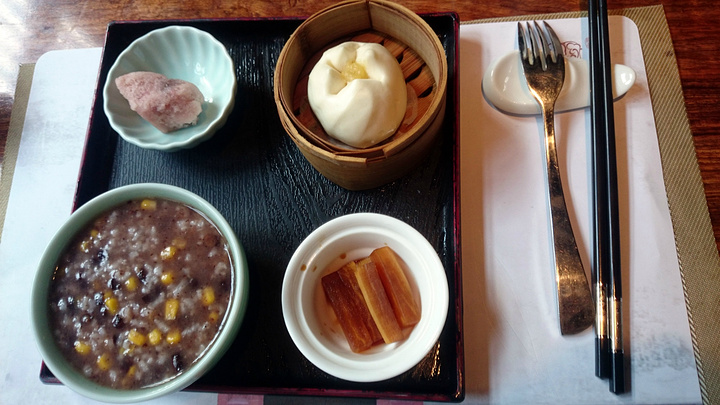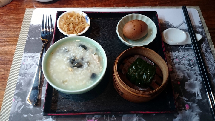 第二天的早餐,有三种粥可以选择,我们三个人刚好每个口味来了一份。其他还有自助的点心和小菜可以自己拿。粥好像是不续的,如果不觉得饱可以在自助区拿馄饨炒饭之类。