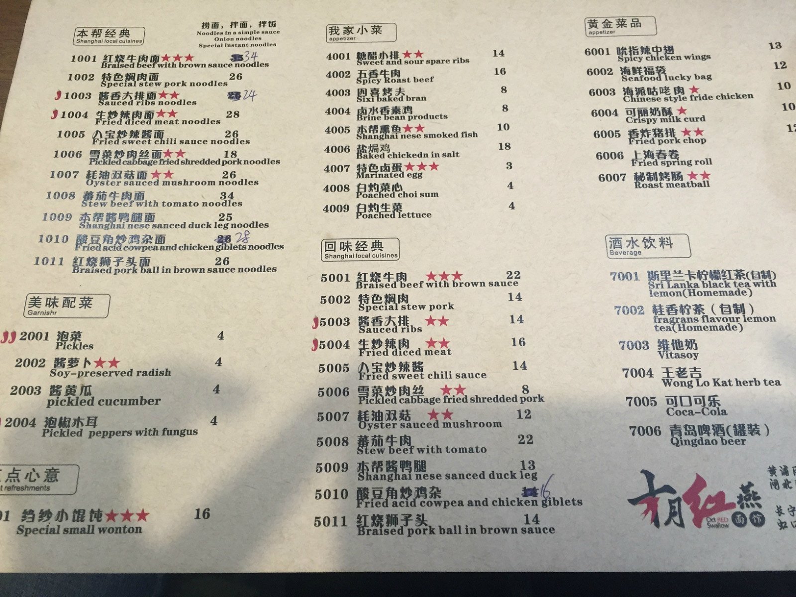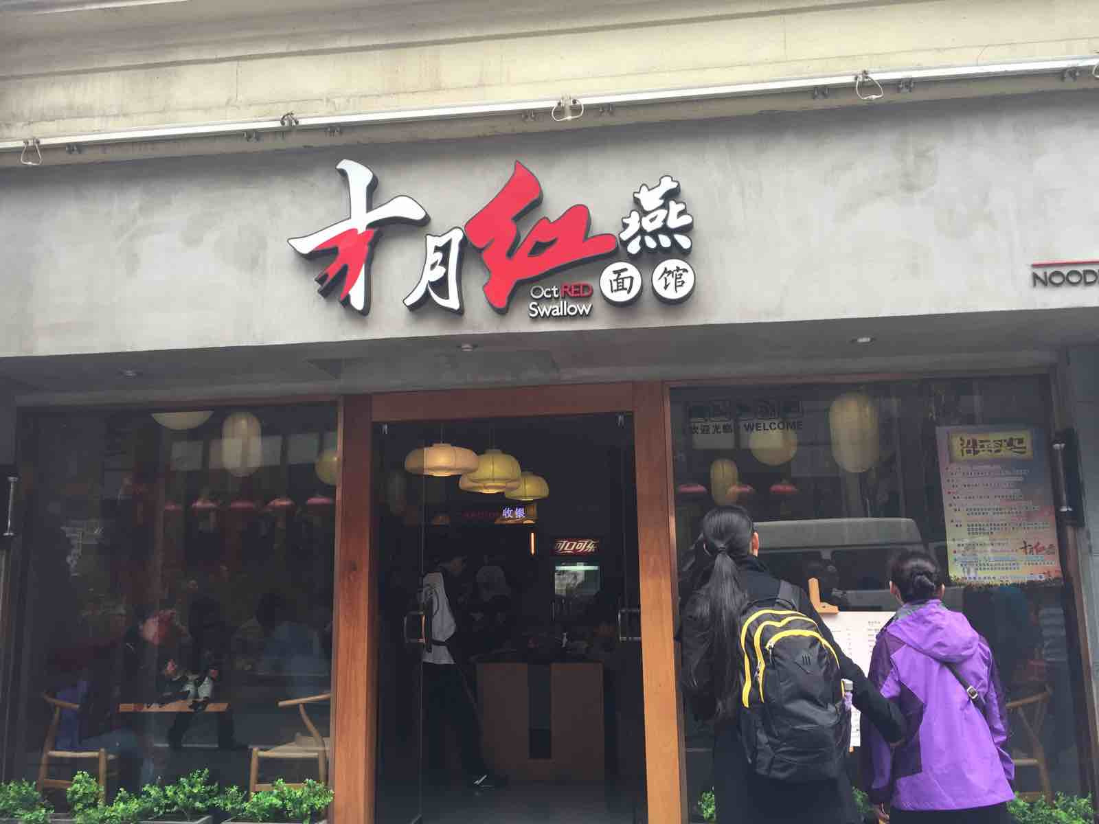 十月红燕这名字听起来像武侠小说里面的,但这却是上海福建中路的一家面馆。之所以找到这家面馆并不是因为它有多出名,而且因为它在人民广场附近,并且价格比较实惠。南京东路上一瓶矿泉水八块钱堪比景区物价,所以附近的小吃都比其他地方贵很多。这家面馆距离南京东路不远,在一条弄堂里,因为整体装修显得很现代干净并且价位也不高所以果断去吃了,没想到味道很惊喜。