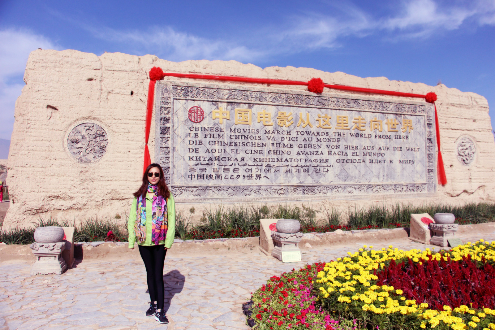 而在另一侧的出口处,有一块大石板,很好的记述了影视城对于中国电影界的意义,