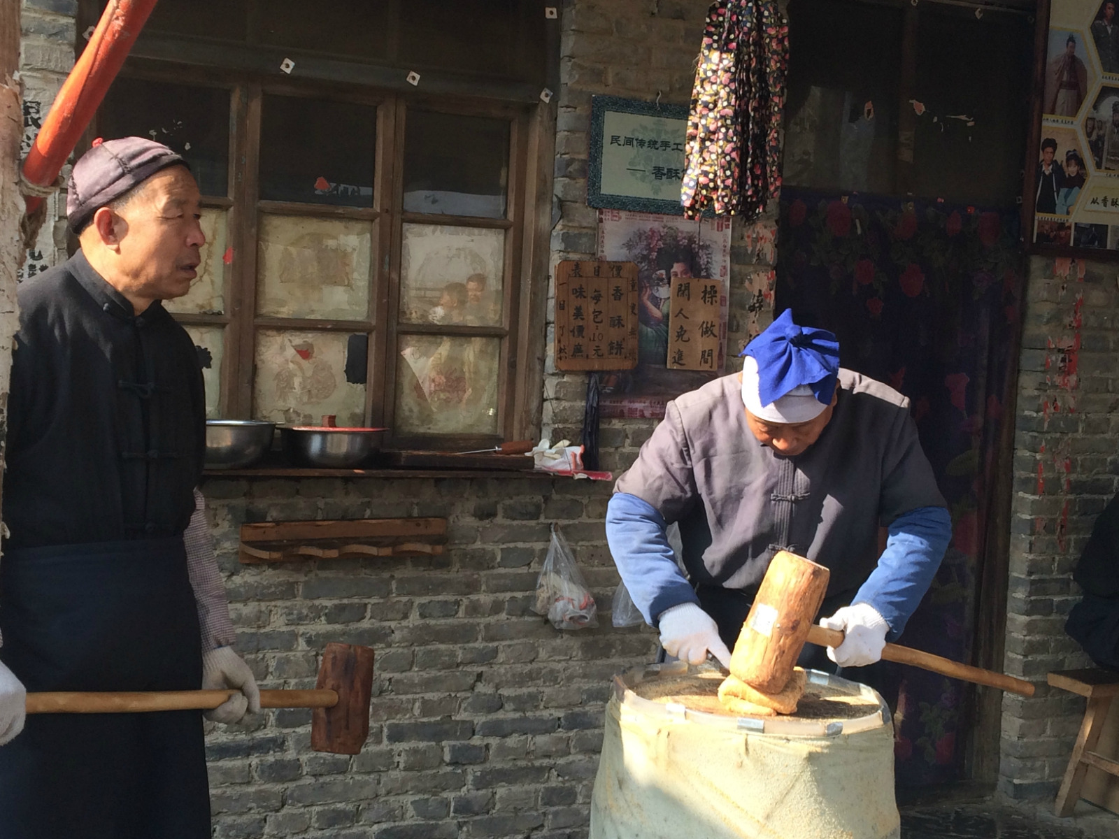 正在吆喝着做用锤、用磨做黄米糕的老大爷,