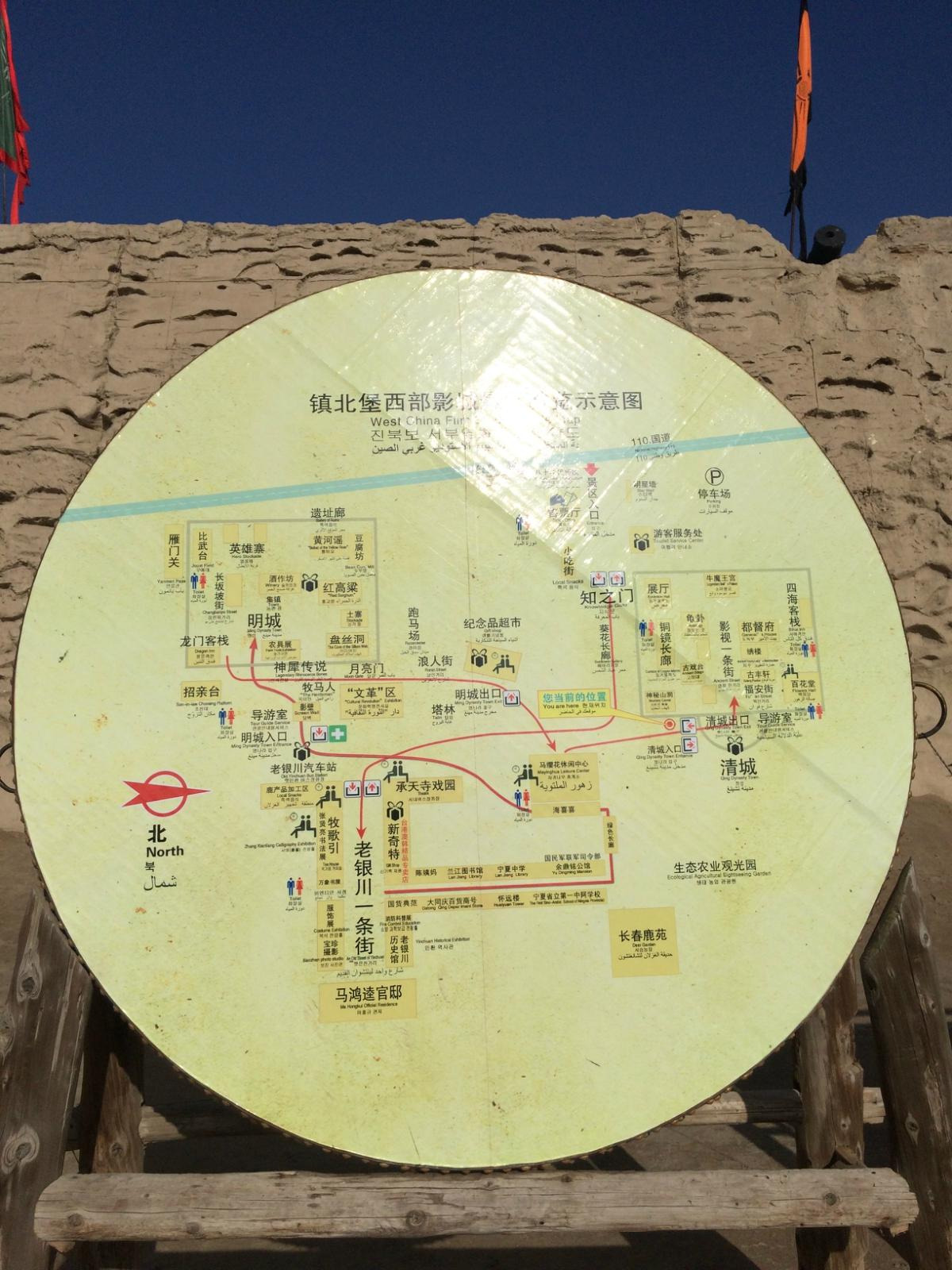 从景区的地图上可以发现,这里的大景区有3个:明城、清两城和老银川一条街;而其中,个人认为最值得看的当属镇北堡清城“视城一条街” :