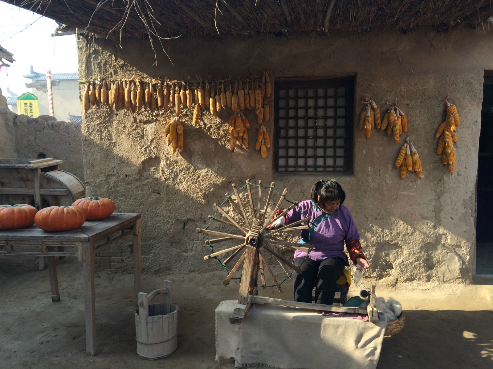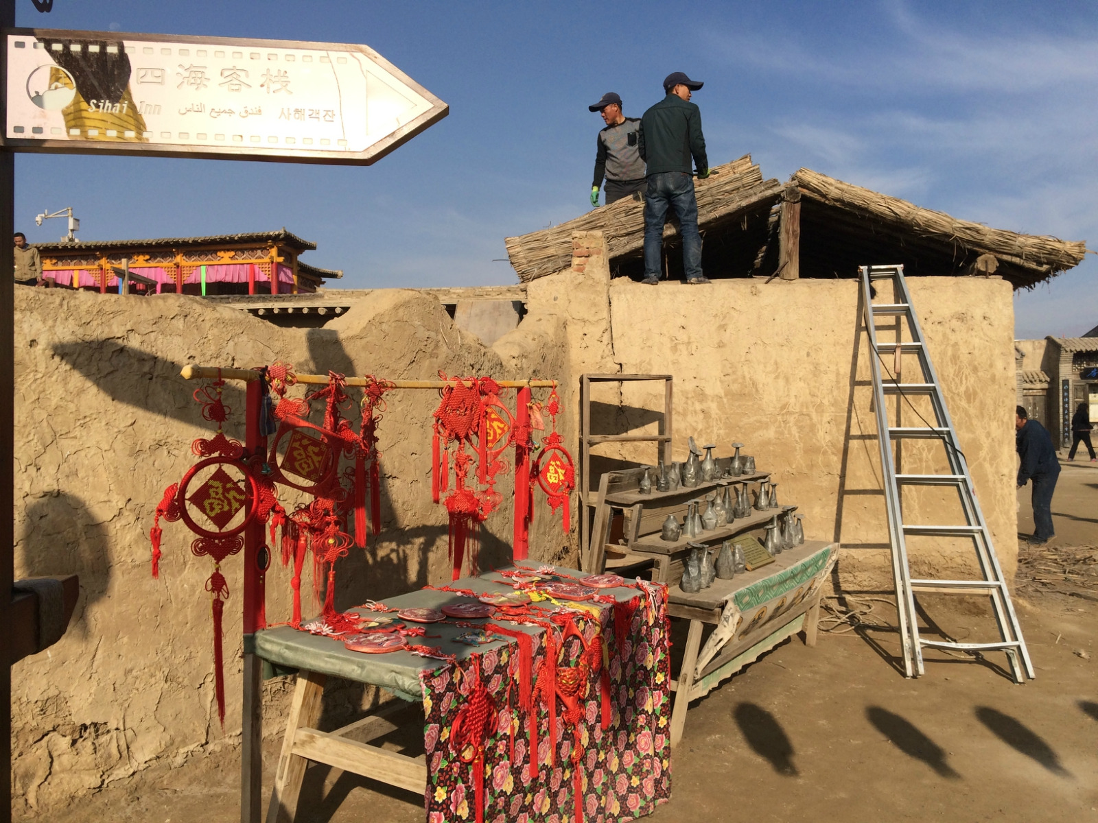以及正在为下一个剧组拍戏搭建临时土屋的施工人员,