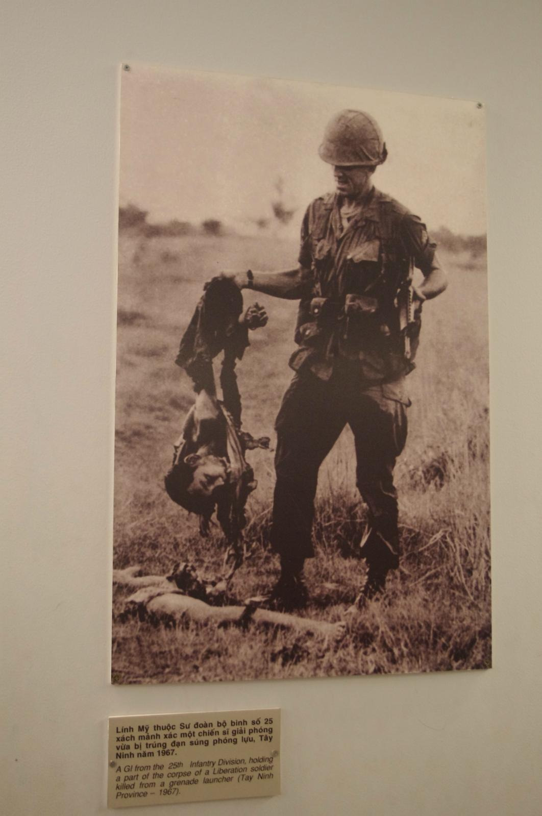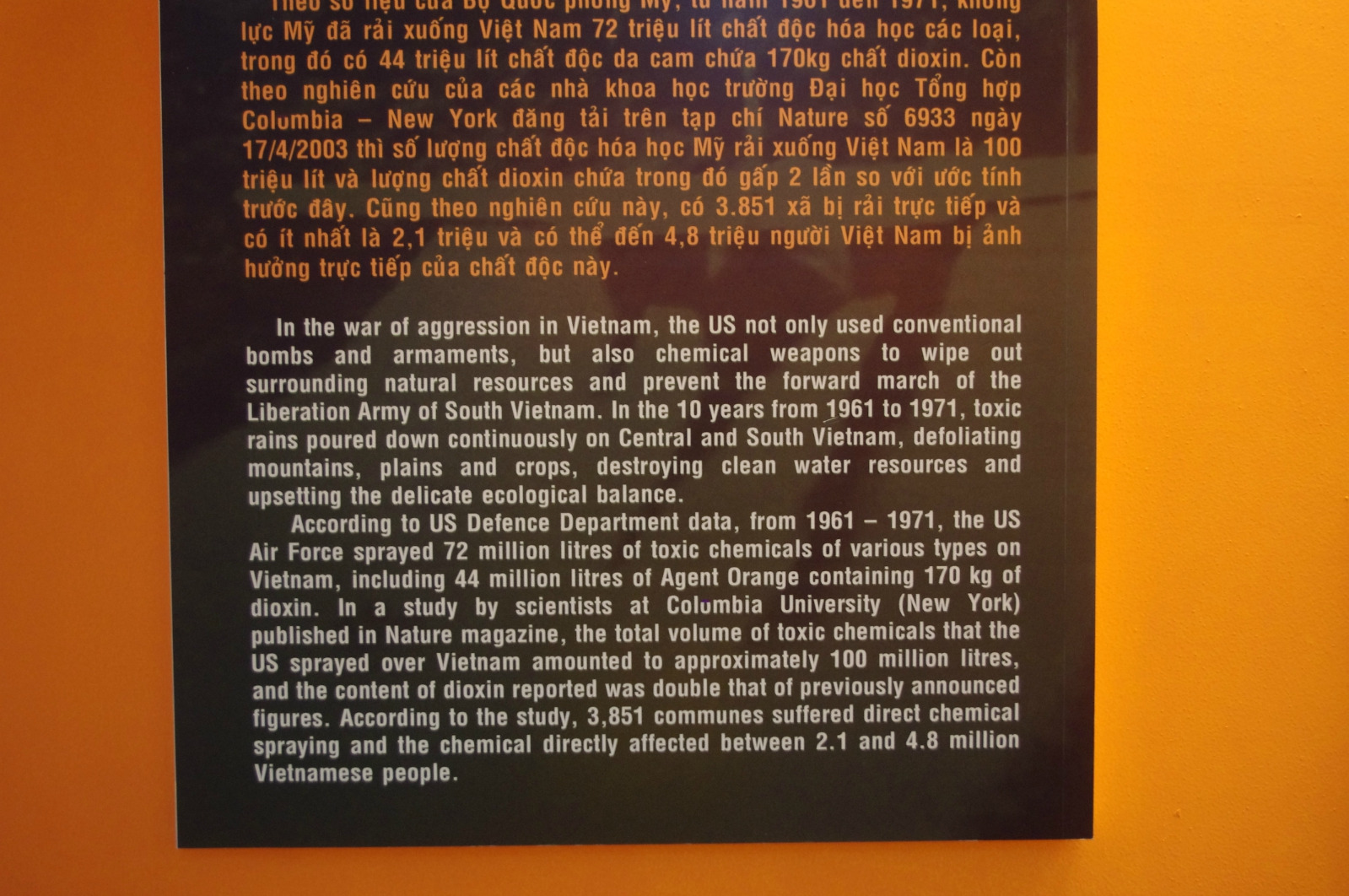 走进博物馆的一楼,在左手边是一个儿童画展,画的内容都是关于和平的。上去二楼,开始就是关于越南战争的历史介绍,有炮弹,抢,军服,行军用的日用品等等,还有用过的防毒面罩,最印象深刻的是一个畸形的婴儿标本,通过博物馆了解到当时越南经历了生化武器的毒害有多深。