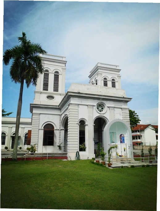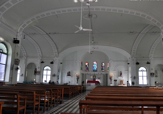 圣母升天大教堂(Cathedral of the Adsumption)位于槟城博物馆旁边,在一个整洁小院子里。前面是一尊圣母玛利亚雕像,后面才是圣母升天大教堂。叫“大教堂”,其实并不大。这也许符合槟城,特别是乔治城的特色,除了光大外没什么更高大的建筑。但却全部是精致美好的模样。
