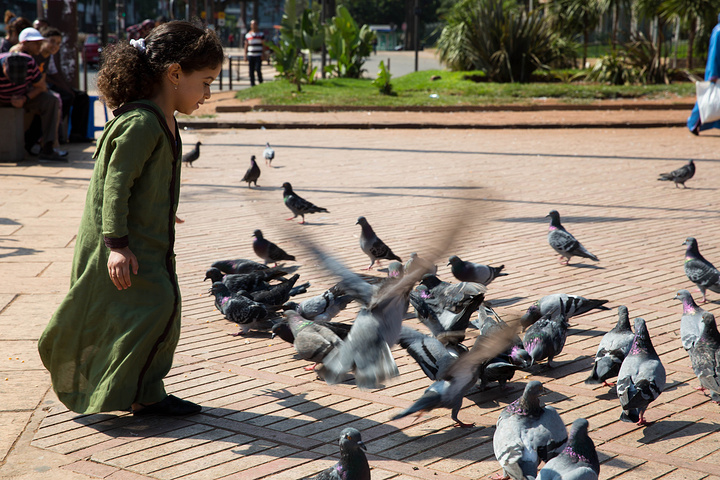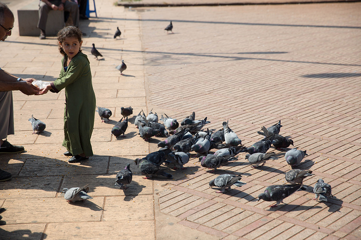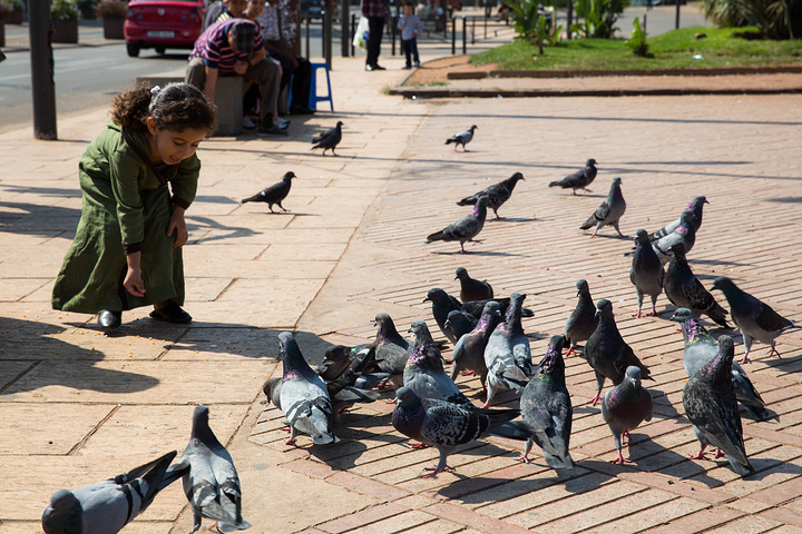 年长的负责提供食物,年少的拿到食物后就很开心的去喂食广场的鸽子。