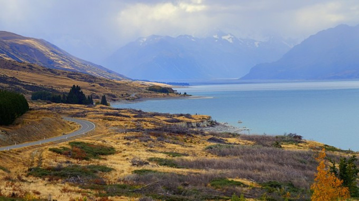 在空气通透的日子,从普卡基湖畔可以看到远方的雪山。不过这个季节雪很少,而且显然此时的山区正在下雨。但我们还是朝库克山开去。路程的前半段都沿湖左岸行驶。新西兰的旅行服务体现在一切细节,比如一路都会看到观景点的标志,如果想下车欣赏的话可以提前做好准备。普卡基湖左岸比较有名的停车点就是Peter's Lookout,在这里摄影可以同时拍到雪山、湖水、蜿蜒的湖岸和公路。有时间的话还能下到湖边玩。
