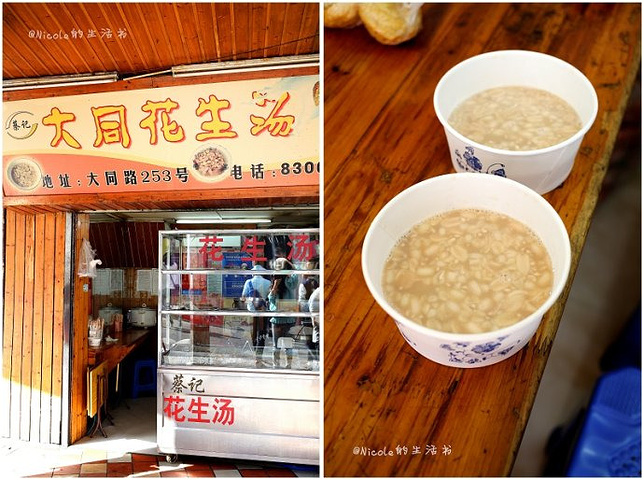早就听说厦门的花生汤著名,但外地人往往冲着名气大的店去,实际却辨不清到底哪家最正宗,好在我有闺蜜尒尒带路,这个地道的厦门妞儿也是地道的吃货,跟着她走,绝对可以吃到最地道的厦门小吃。 这家思北花生汤和大同花生汤是紧挨着的两家小店,但是真正好吃的花生汤在大同,花生多,绵绵软软的,第一次品尝花生汤,竟然如此美味,我爱花生的一切东西。