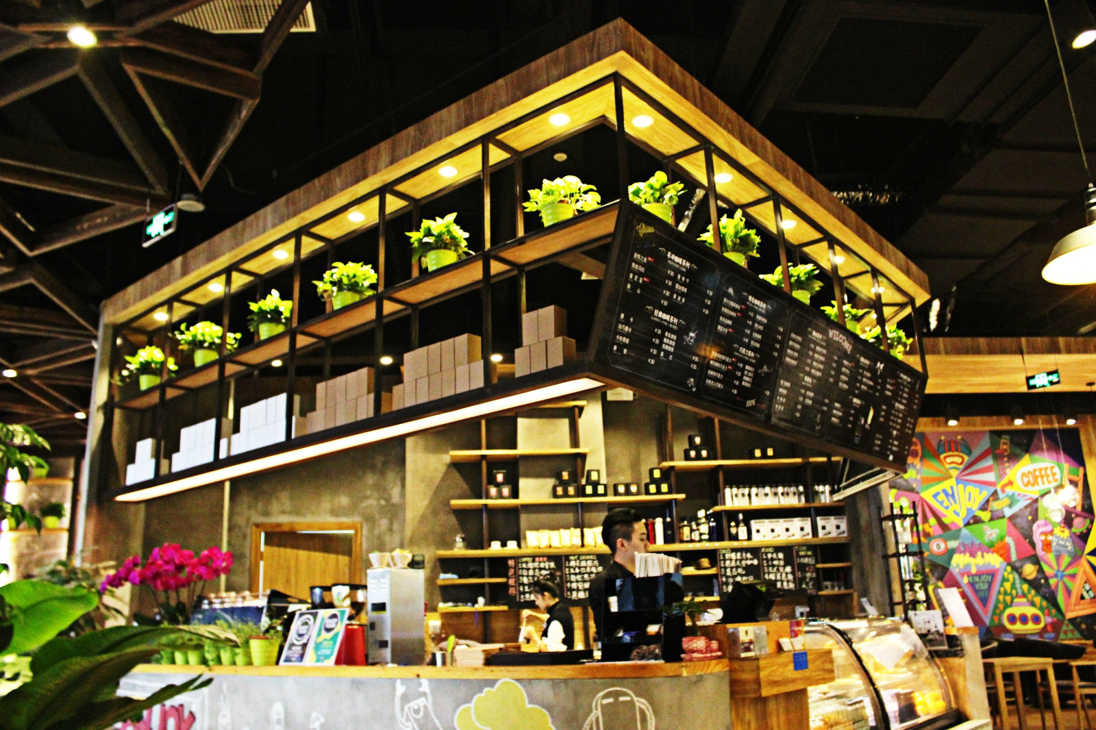 悦咖啡的装修很有自己的特点,整个内部给我一种视觉冲撞的感觉,因为吧台左边都是很文雅的书架、绿植这些小清新元素已经落地玻璃墙,充满了文艺风和小清新风,而吧台右边确实涂鸦的墙、一种街头文化和活力元素又出来了。看似两种完全不想干的文化在这里发生了碰撞。