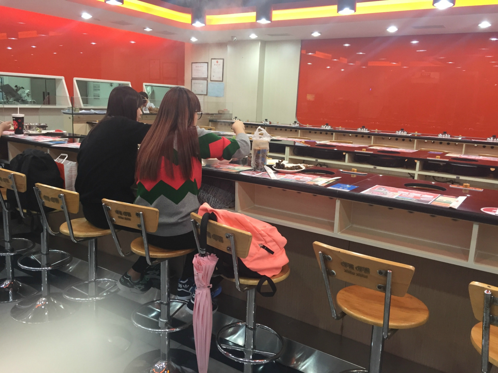 【店内环境】店内干净整洁,中间一圈是吧台,一人一锅,旁边一圈是小桌,是传统的鸳鸯锅,空间利用很充分。