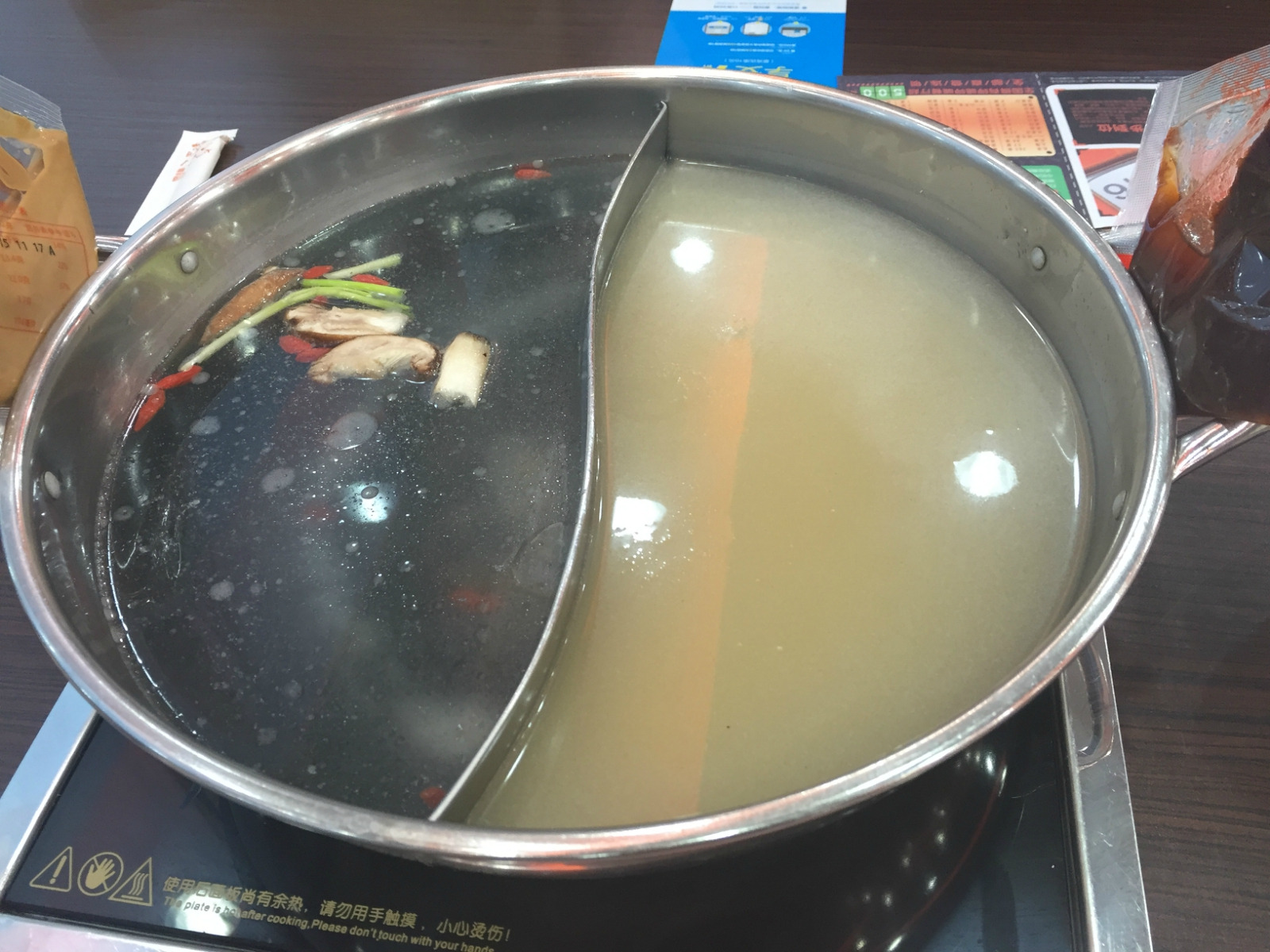 【鸳鸯锅】个人不喜欢吃辣的,一份菌汤一份清汤,加热速度挺快的 。