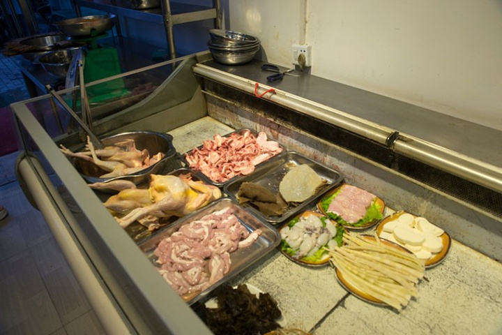 好啦,终于找到觅食的地方了~本来在网上搜索过,我是想要去当地有名的饭馆李家河鲜去试一试的,后来听了宾馆老板娘的推荐,就改来了这家瑞成酒楼吃酸汤火锅~酸汤,我也超爱~ 一进酒楼,扑鼻而来就是酸汤的味道,这味道跟泰式冬阴功汤的味道很像。酒楼生意很火爆,一楼都坐满了,服务员问我多少位用餐,我说就我一个,然后他们感觉很惊讶~然后就在酒楼门口点菜,我当然是点这里最有名的酸汤猪脚煲啦,上面这些是可选的火锅菜,当然还有很多素菜,没有拍到。
